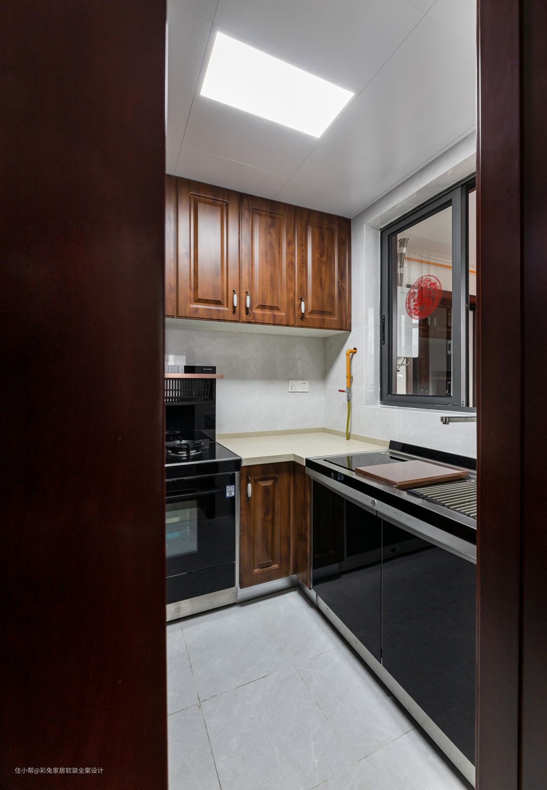 厨房延伸到阳台区域,用白色铝扣板集成吊顶,空间感更宽敞明亮。