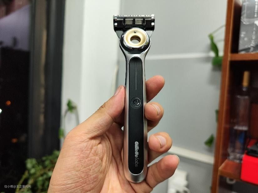 拆开盒子后,我终于见到了吉列热感剃须刀的本体,整体外观设计还不错,正面下方印有“GilleLabs”的Logo。中间是电源键,上面是一个长条形的灯,再往上有个圆环设计,然后就是刀头了。
