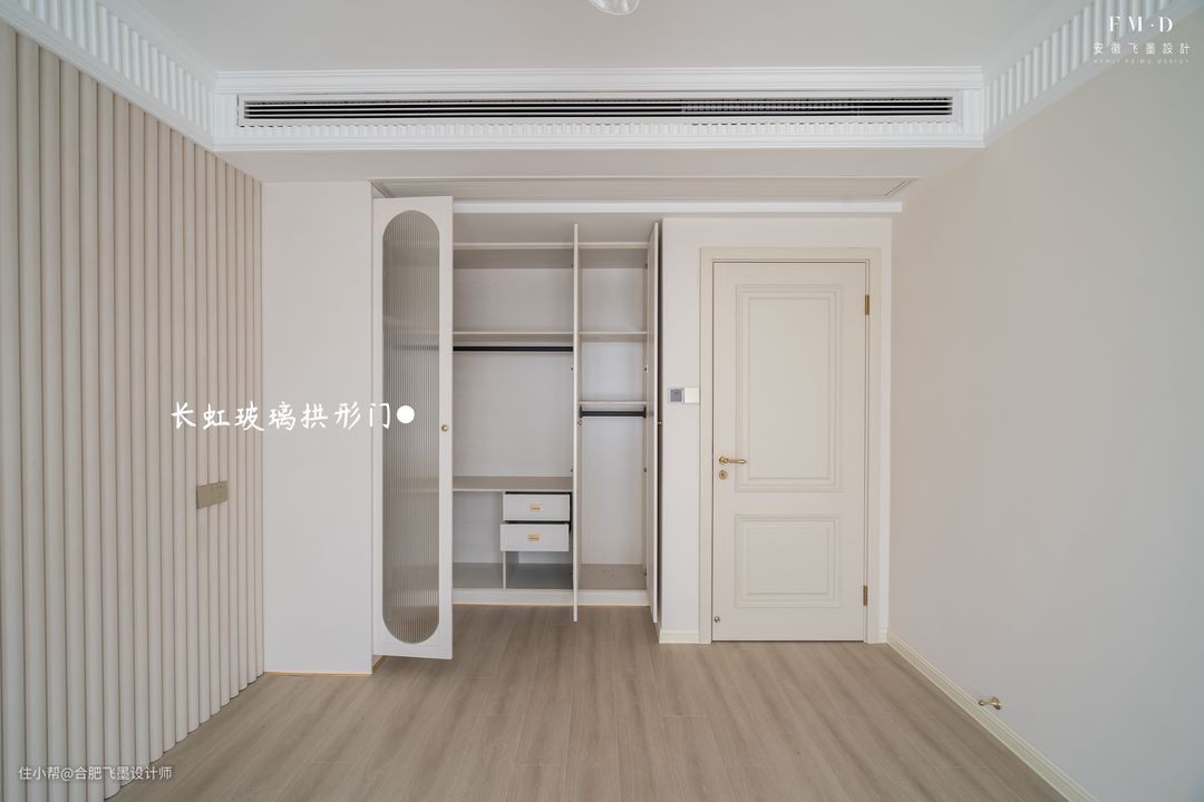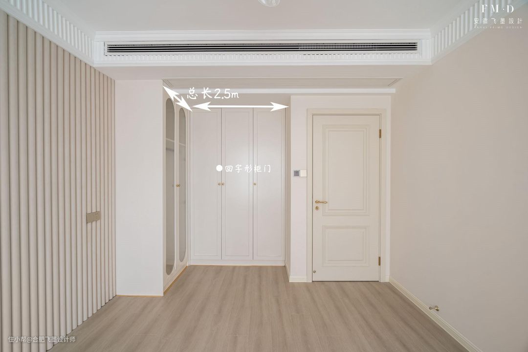 柜体总长2.5m,进深53cm,分布于两侧呈L型布局,内设挂衣区、叠衣区、抽屉柜以及被褥区,收纳力充足满足多样性衣物存放需求。柜门设计也是一大亮点,一边是奶油白柜门搭配回字形造型,凸显层次感质感也是十足。
