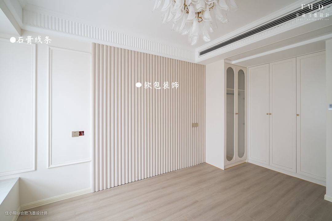 床头石膏线条刷乳胶漆并加以软包装饰,既达到了保护墙面目的,同时也给人温馨的感觉,营造一个舒适的睡眠环境。