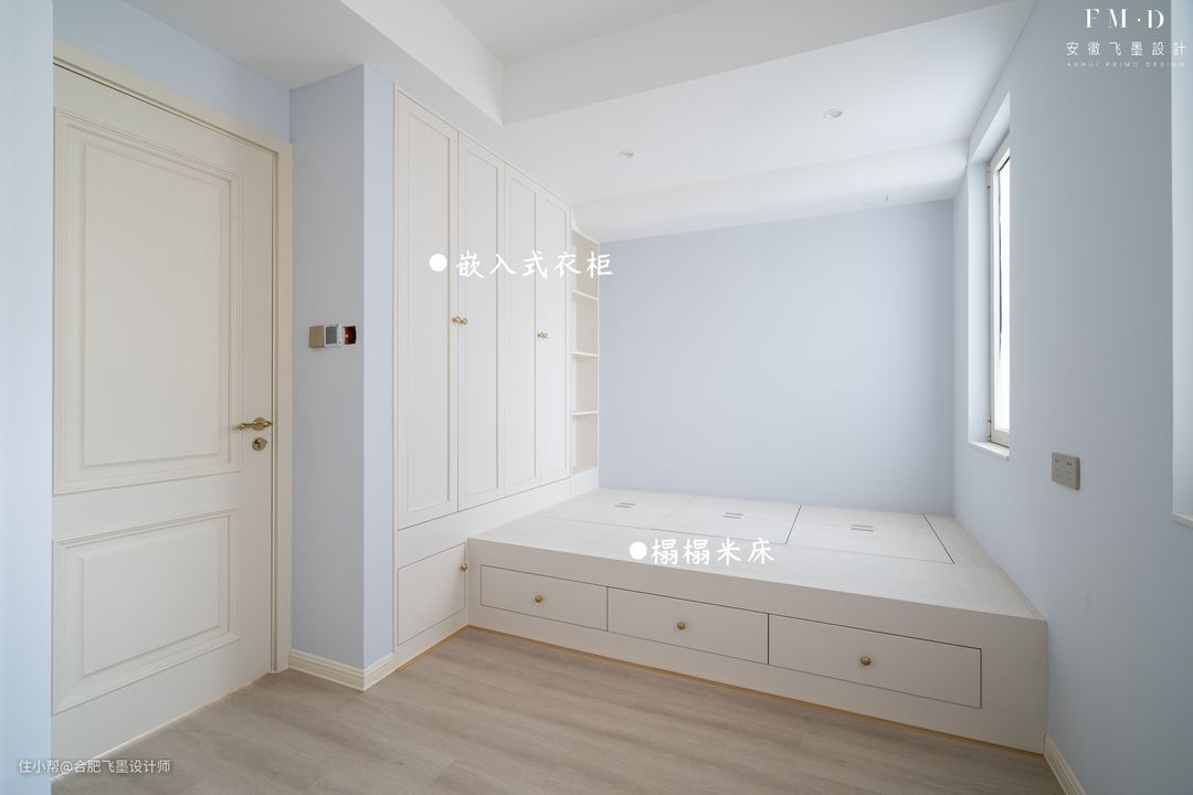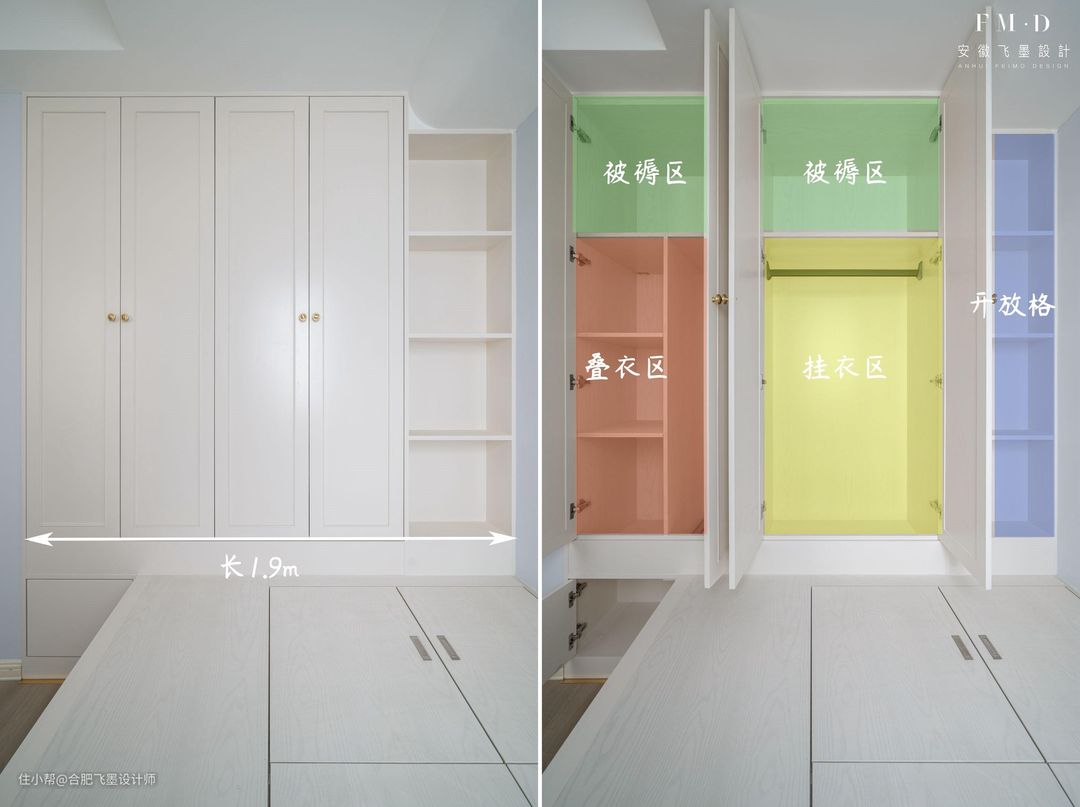 靠墙便是嵌入式衣柜了,长1.9m,进深53cm,内设挂衣区、叠衣区以及被褥区,满足今后多样性衣物存放需求。至于床头柜也直接省掉,注意到衣柜右侧没,特地留出一排开放格,上下共计4层,这样夜间休息时,像是水杯、手机以及书籍等,都可存放于此,好拿好取。