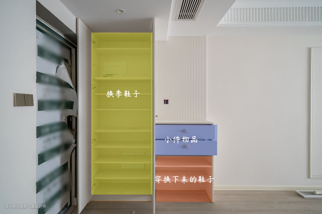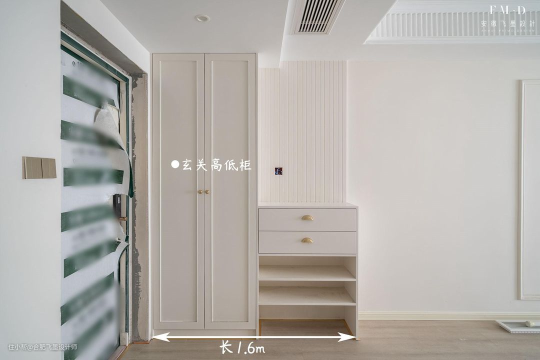 入户并无玄关为了满足收纳需求,干脆贴左侧装一组长1.6m的高低柜,内设多层层板一年四季的鞋子都足够放。右侧矮柜由2部分组成,上半部分抽屉柜可以放些小件物品,避免丢失。底部层板则可以用来收纳穿换下来的鞋子。