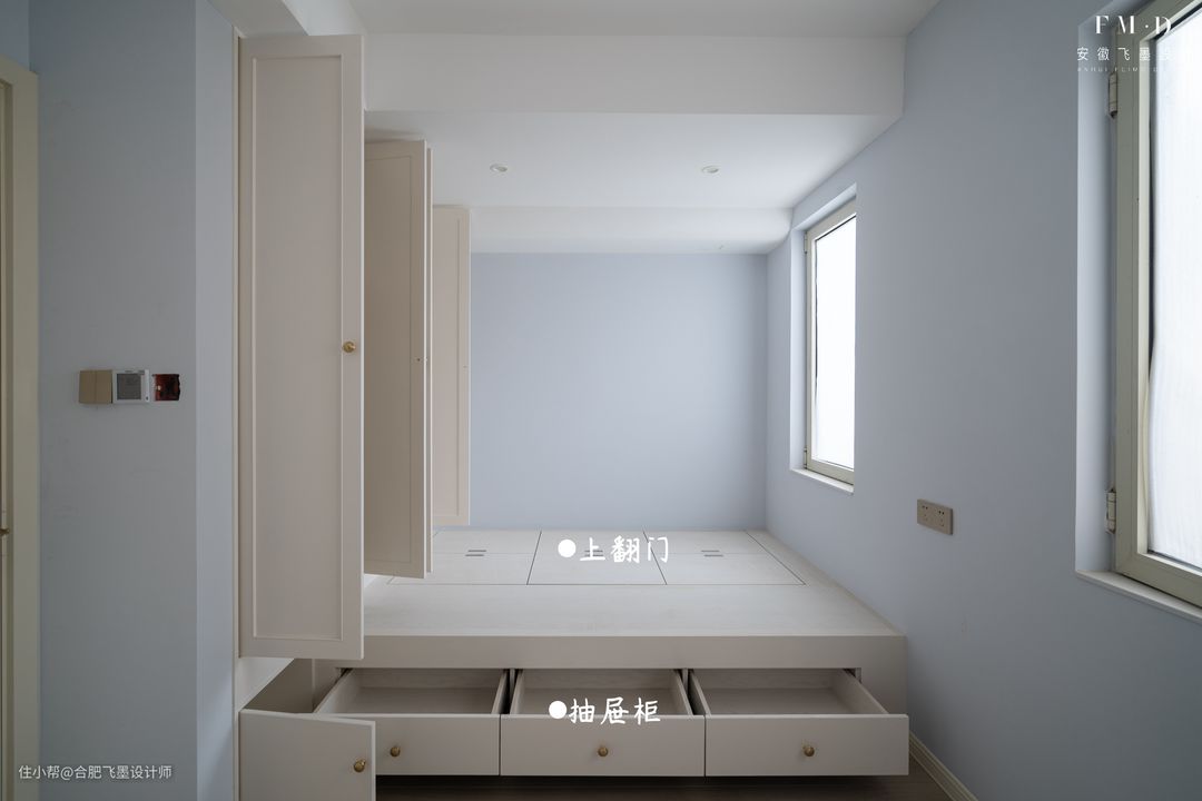 除此之外,床板上方还设计了上翻门,搭配底部的3组抽屉柜,像是一些日常杂物,也都有了“容身之处”,不至于到处乱塞乱放。