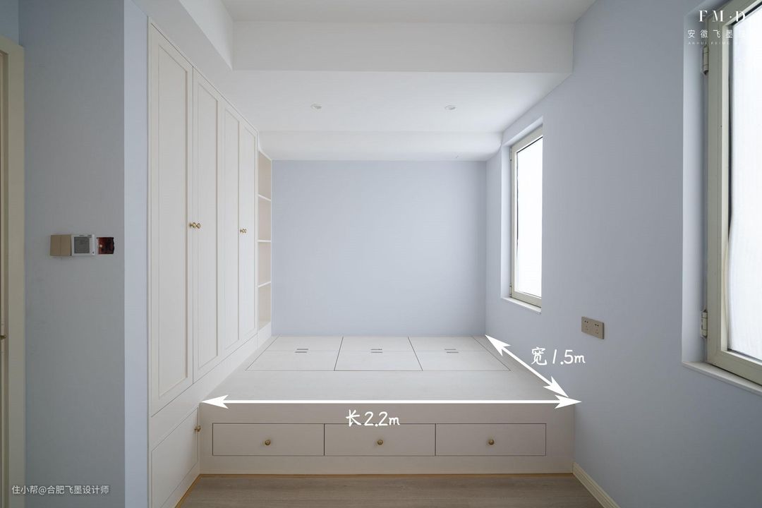 整个榻榻米柜由2部分组成:榻榻米床+嵌入式衣柜。先来看看榻榻米床,床板长2.2m,宽1.5m,满足两人休息功能完全绰绰有余。