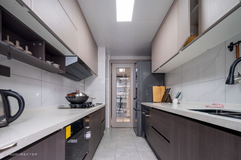 二、橱柜不要做太高,平层一般的高度在2米左右,做完20公分吊顶,通顶橱柜最上层放的东西对一般身高的人来说还是很难拿到,这里建议与设计师商量一下吊柜不做两层,并且根据家庭成员使用者的身高及操作习惯设计橱柜。
