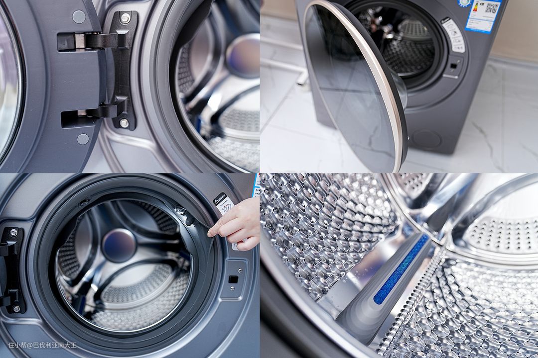 其中硬件上除了刚刚提到的分子筛,本身材质就是抗菌+干燥风路以外,还有桶内银离子抑菌、抗菌防霉门缝、智能喷淋系统、304不锈钢内筒等硬件抗菌抑菌加持。