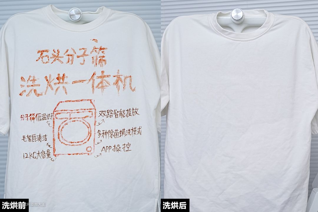 看下清洁效果对比,白T上涂满的粘腻番茄酱,全部被洗烘的干干净净,没有一丝痕迹。
