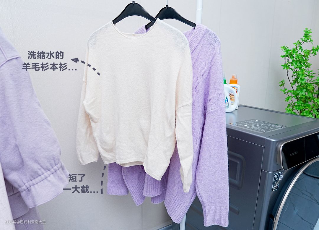 先给大家看下我用其它洗衣机洗的羊毛衫,缩水缩到惨不忍睹...原本它和后面那件羊毛衫的长短是一样的,结果机洗后短了一大截,穿上秒变露脐装...