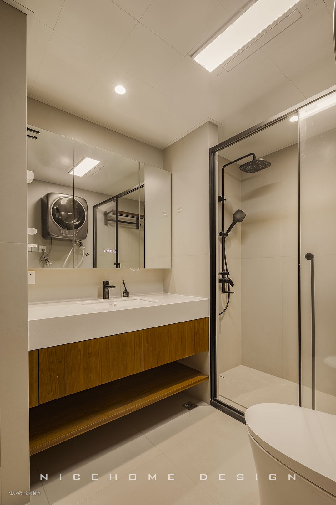 除了正常的洗衣机、烘干机外,家里有宝宝或者对内衣清洁要求高的,都会在洗手间安装个壁挂小洗衣机,记得预埋50管,方便穿洗衣机管线,尺寸要严格,结合厂家的安装建议。
