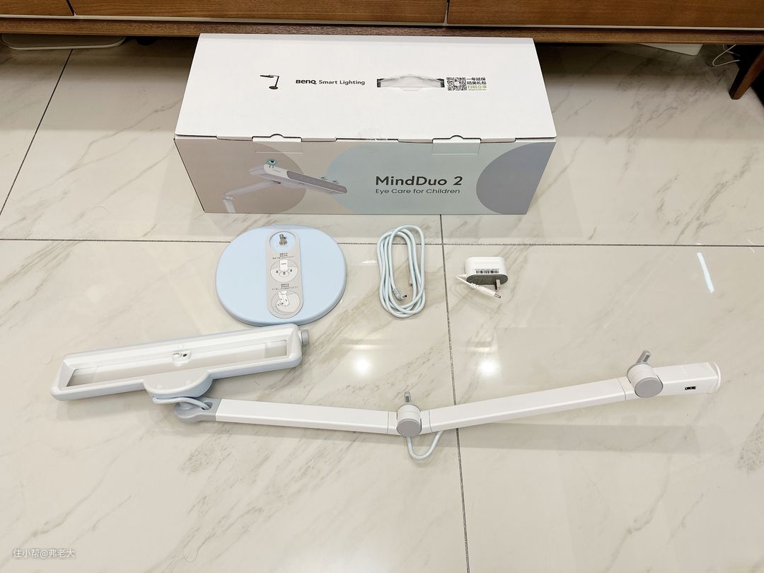 取出盒中物件,灯具分为灯臂、底座、电源线和电源适配器四个部分,既可轻巧包装,也能快速便利组装。宝爸甚至无需看说明书指南,约2分钟便徒手完成了组装,一台精致可爱、富有亲和力的台灯呈现于眼前。
