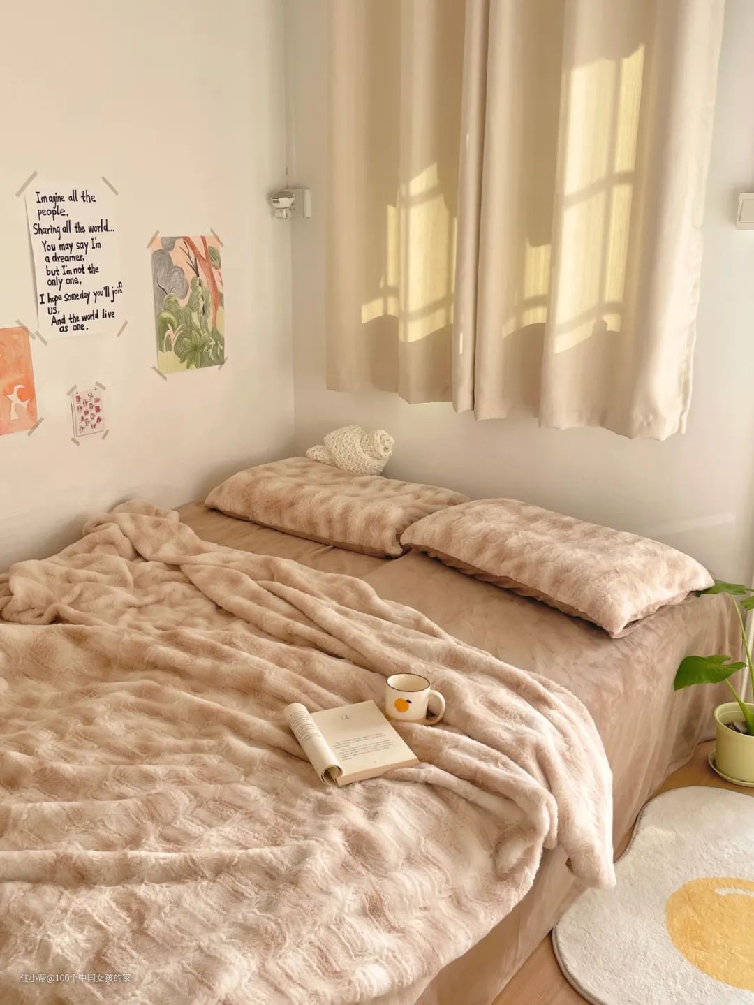 明亮整洁的小屋,阳光正毫不吝啬地洒在被窝上,绿植被风轻轻吹拂着,窗外视野无遮挡,望着蓝天、绿荫。
