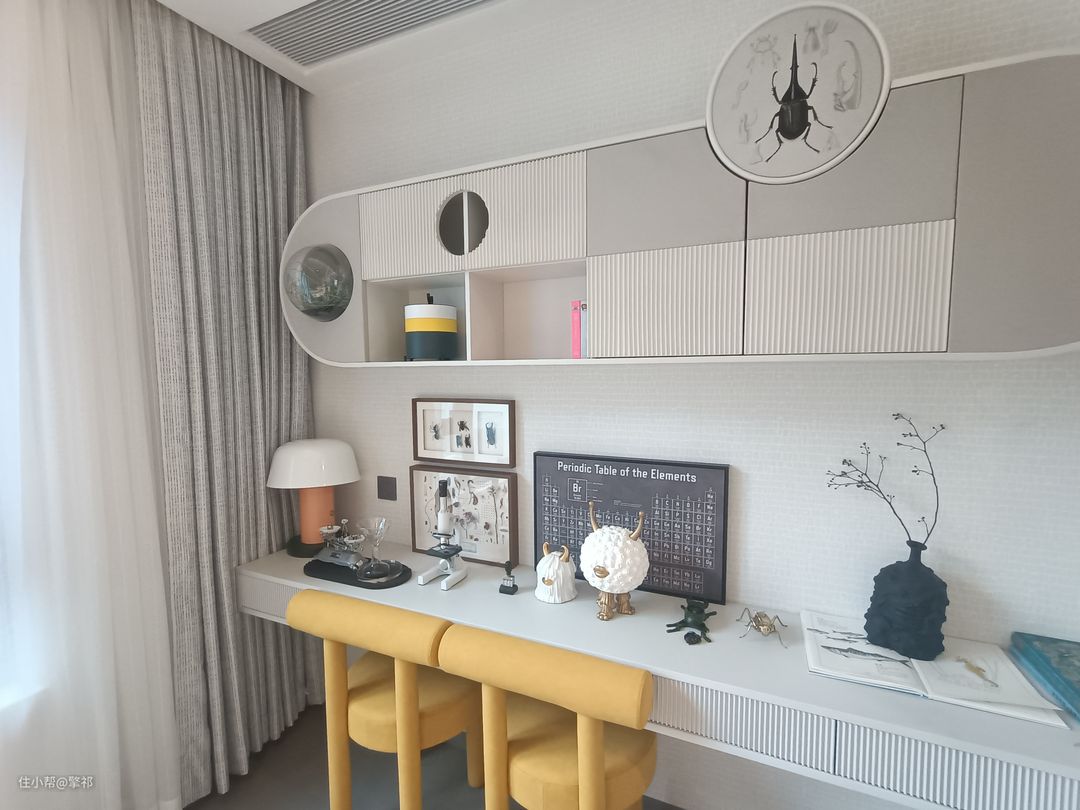 同时书桌上方做弧形壁柜,日常的书籍+手工摆件都可以收纳,非常的方便。