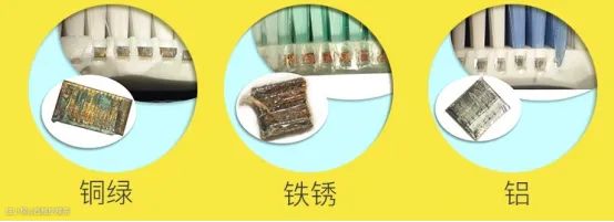 由于制造工艺的限制,很多电动牙刷在刷头里面都有一块金属垫片,打孔后便于把刷毛植入指定位置,方便固定成形,这些金属垫片没有密封,而是长期和水接触,使用三个月以上必然会产生铜绿、铁锈等有害物质,长时间使用这种金属植毛的刷头会更是会损害人体健康。