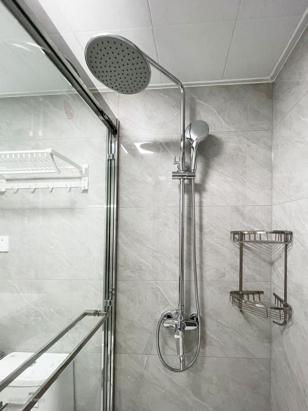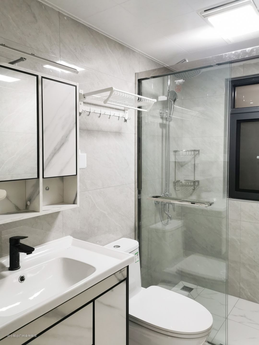 台盆区镜子的上方加了镜前灯,就变成了一个智能镜柜。现在市面上很多智能浴室柜无非就是三种功能,第一个是补光 当化妆镜,第二个是储物,第三个就是防雾,但因为做了干湿分离,沐浴间做了玻璃门隔断,上方又有换气扇,镜子本身不会有特别多的雾气,所以只需要加条补光灯,就能满足智能镜柜的功能了。另外沐浴间做了不锈钢超级窄边框,也更加美观。