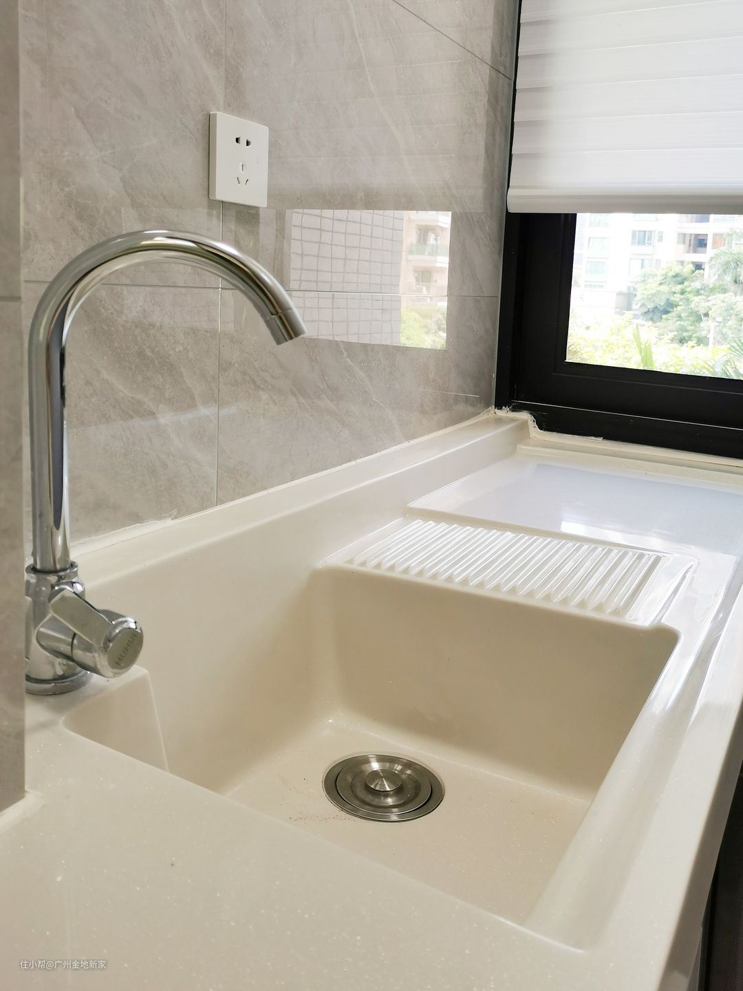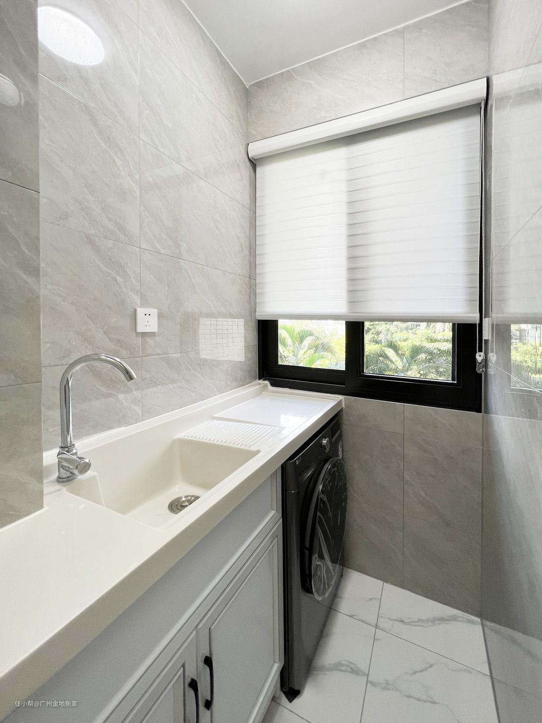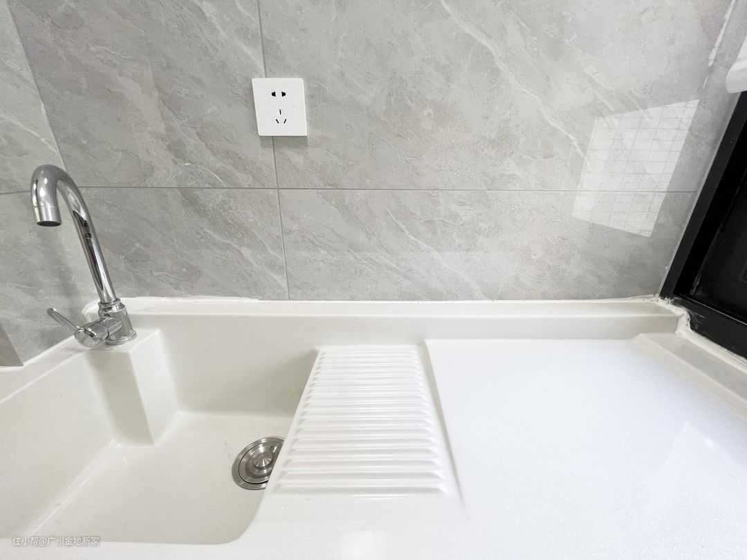 台面用的是石英石材质,做坡度处理,正常来说应该是要做25°,但是考虑到下方还要存放洗衣机,所以做成18°的角度倾斜,也依旧能保持洗衣的水可以自动流入下水口,不容易积水。