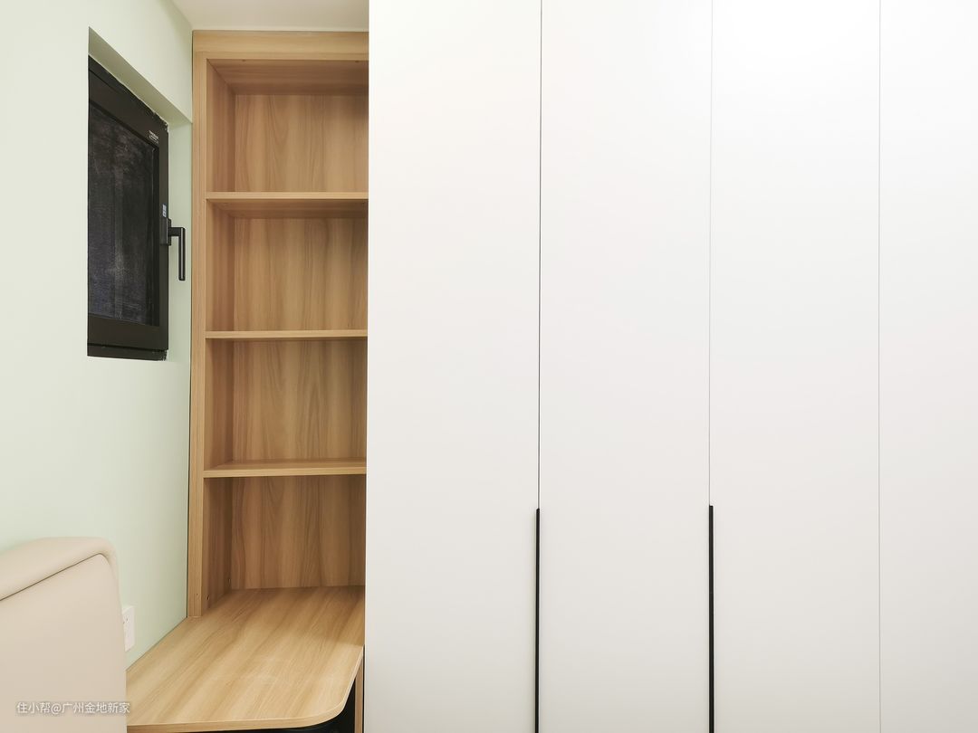 衣橱靠窗的一侧同样做了穿插层板,可以当做一个小小的书桌角使用,上排是书架,下端是可以存放较大物件的开放柜,例如双肩包、鞋盒、抽纸等,都可以收纳其中。