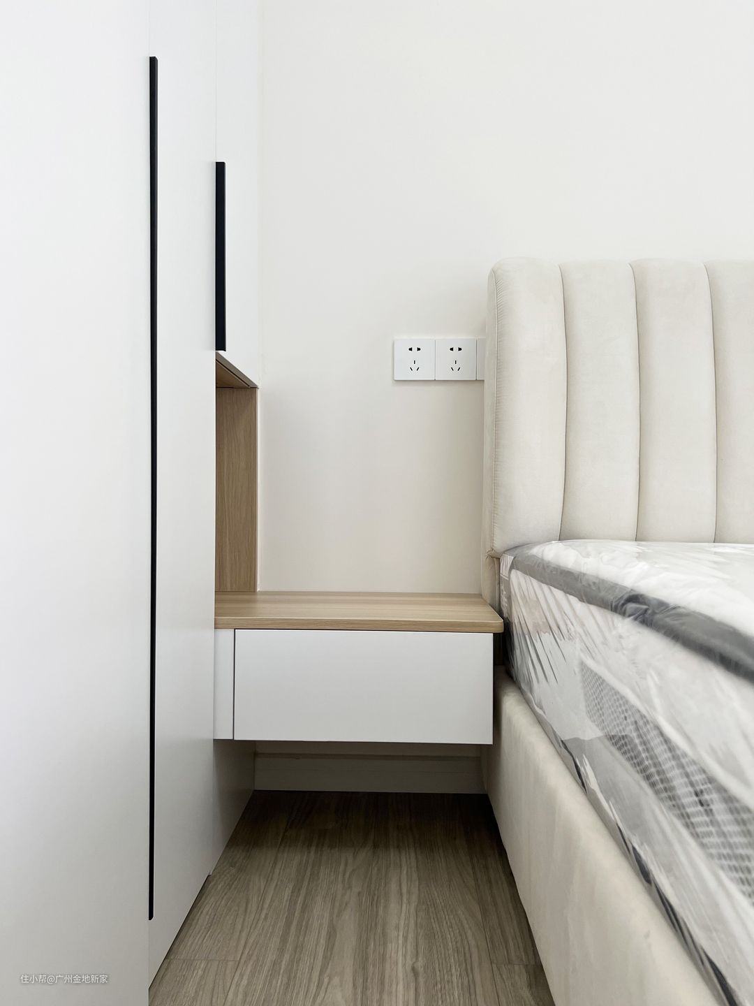 卧室的软装还没有到,只能先以竣工的模样和大家见面啦。 主卧的窗台和客厅的是一体的,我们在两个空间的衔接处做一个窗台书桌,隐藏其衔接口。在这里屋主可以在窗台观景靠坐,也可以作为学习办公角/化妆桌使用,极大程度提高了空间的利用率。