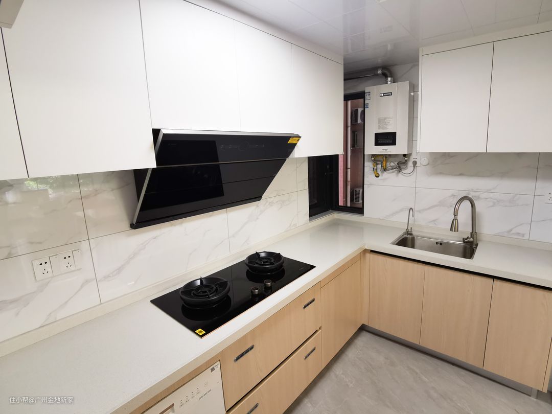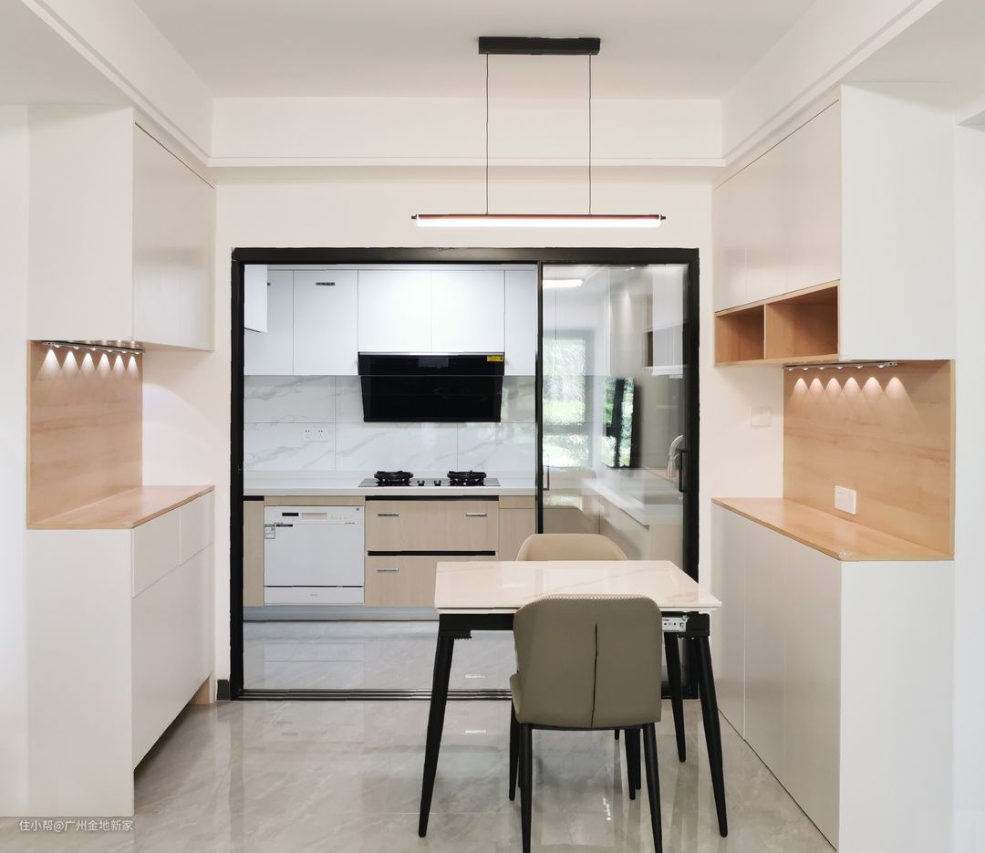 厨房整体风格也和餐厅一样,保持了同一色系,整个空间更具有整体感,玻璃的滑动推拉门做隔断,平时不会做太大油烟饭菜的时候,敞开厨门,还能变成一个半开放式的空间,通透明亮。