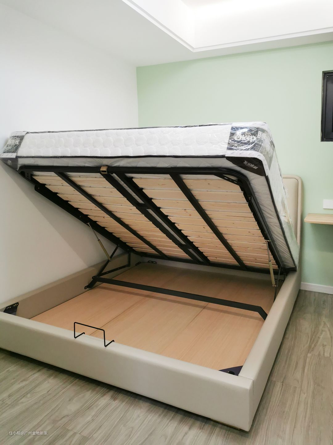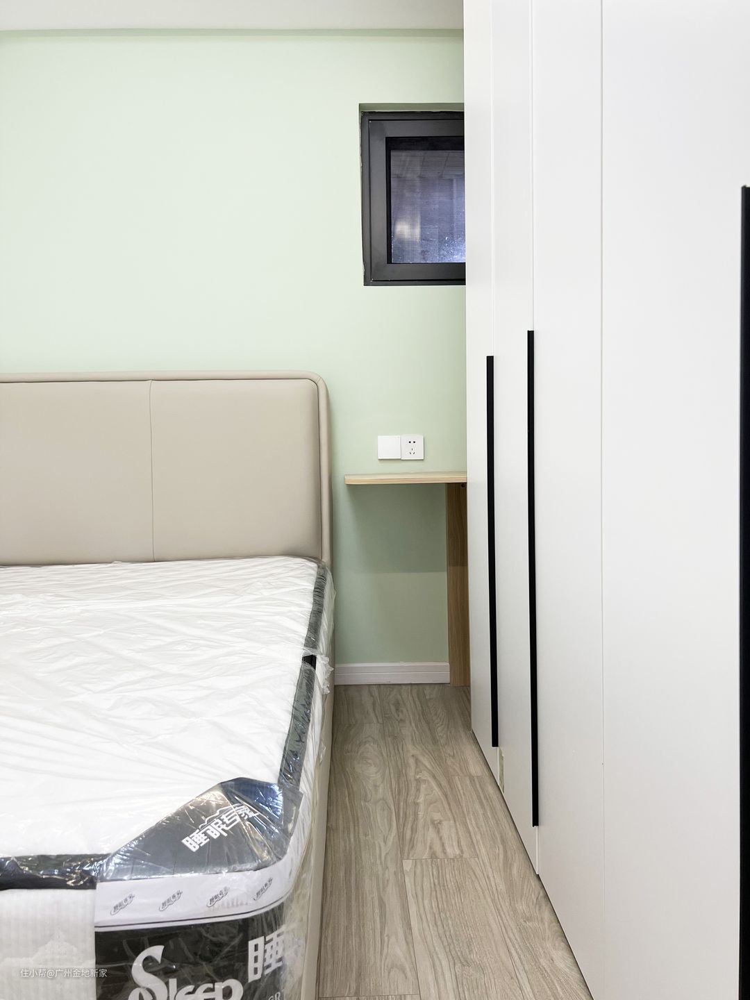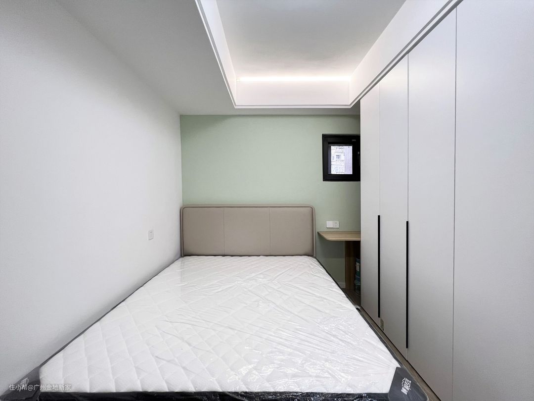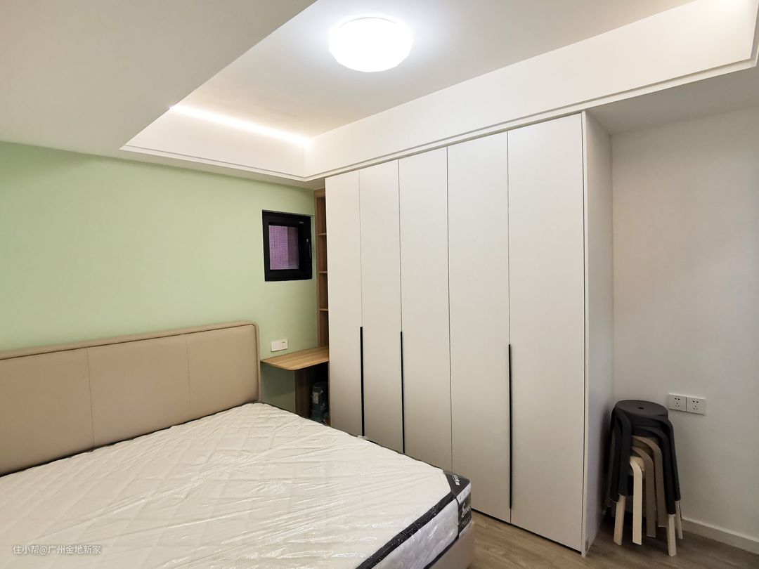 因为主梁的层压,再加上空间的面积较小,我们将墙体刷成薄荷绿(GC4608-4),带来清新又亮眼的视觉感,配上奶茶色的床头软包,一下子温馨又美观许多。