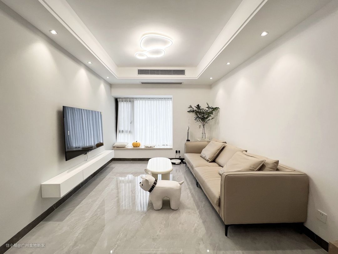 客厅做双眼皮加边顶的设计,隐藏空调机,但没设放灯槽,这样可以避免落灰。简约的主灯设计和两边的内嵌射灯以及自然的采光,给客厅带来明亮又舒爽的视觉体验。射灯选用的是24°的光束角,因为两边距墙体和吊顶的位置都有所区别,所以光弧的范围也有些不一样(射灯离墙越远,光弧范围越大)
