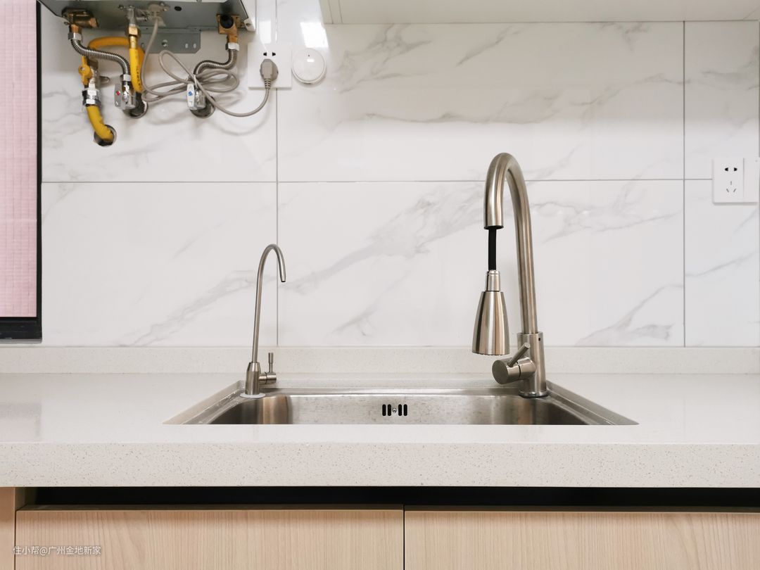 水槽处安装了抽拉式的铜质水龙头,可以洗到水槽的每个角落,不易积灰更便于打扫,清洗瓜果蔬菜的时候也可以省事很多。