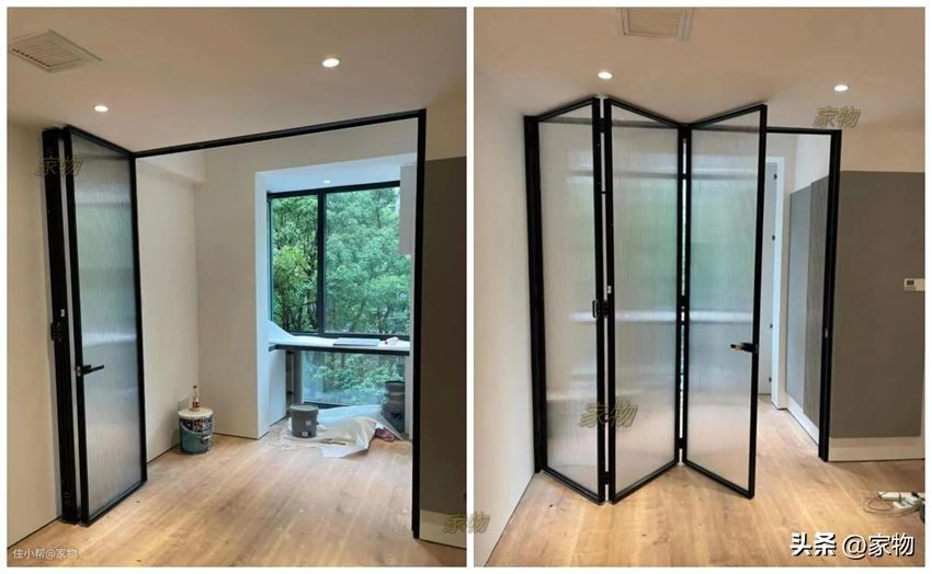 为了解决这个问题,市面上出现了折叠门,确实比推拉门使用更灵活轻便,但门扇90度折叠后依旧要摆放在门洞一侧。
