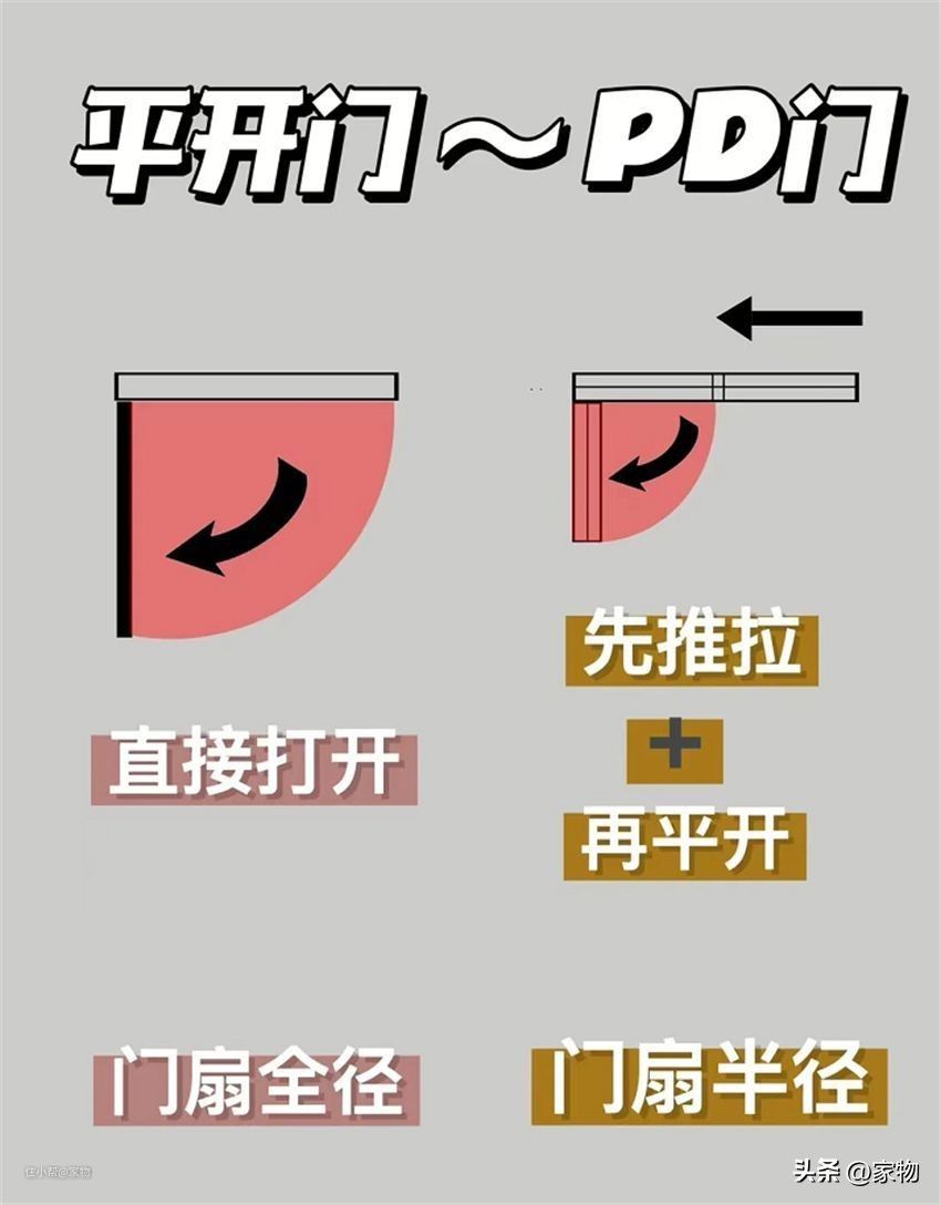 大概是设计师体会到了部分业主使用的痛点,如今又出现了一种新型门——PD门。整体结构由门框、推拉扇、平开扇、吊轨和五金配件组成。