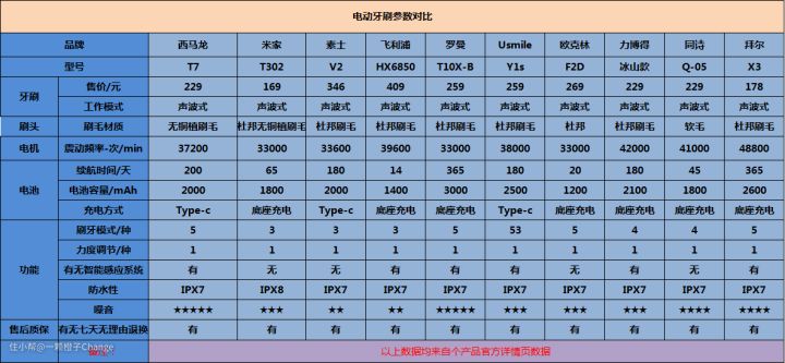 西马龙T7、UsmileY1S、同诗Q-05、拜耳X3、素士V2、飞利浦HX6850、欧克林F2D、罗曼T10X-B、力博得冰山款、米家T302