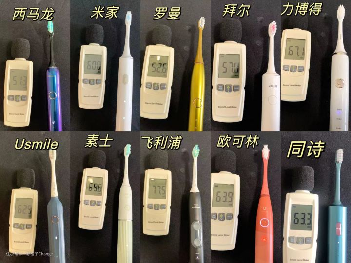 我把10支电动牙刷在相同的安静环境打开,把手机分贝仪放在十款电动牙刷旁边,记录电动牙刷运行时的噪音大小。