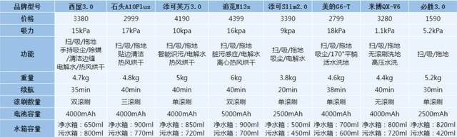 八款洗地机的基础数据见下图,在进入实测之前可以先简单了解一下。