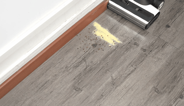 接下来进行干垃圾&贴边测试。这里我使用黄豆粉、绿豆、假发分别模拟灰尘、碎小垃圾以及毛发,并放置在墙边,同时测试洗地机的干垃圾&贴边清洁能力。