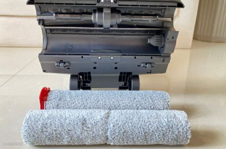 米博这款洗地机是全场唯一一台无拖布洗地机,它的刷头有点像扫地机器人的设计,依靠强吸力,吸入四个滚刷清扫出来的污渍。