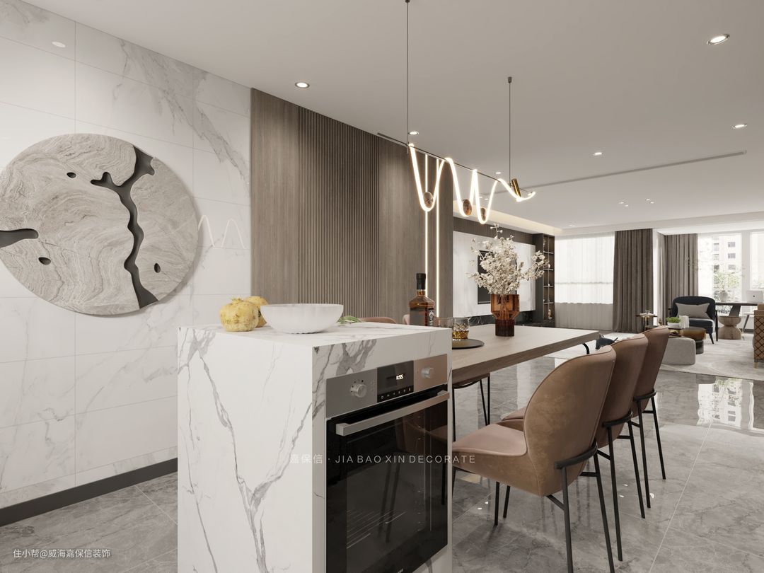 客餐厅一体式、结合无主灯顶面设计,空间简洁开阔。石材与木质碰撞出丰富质感的空间,形成冷暖对比。