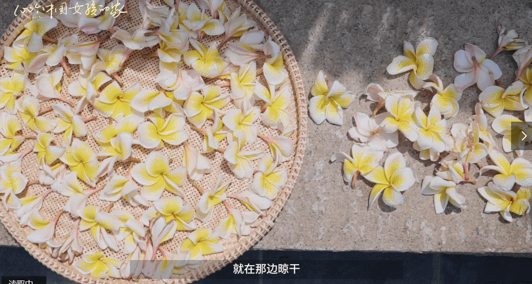 石凳子上晒了一些鸡蛋花,属于广东人的会心一笑:万物都可煲汤煮茶。