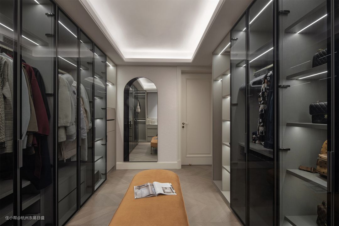 步入式衣帽间设计,利用通透黑色玻璃做柜门,瞬间高级,琳琅满目的衣物饰品鞋包,分类收纳一目了然。延续现代轻奢的方式诠释奢华,简单的手法表现气质与品味,给人时尚简约、温馨舒适的体验。