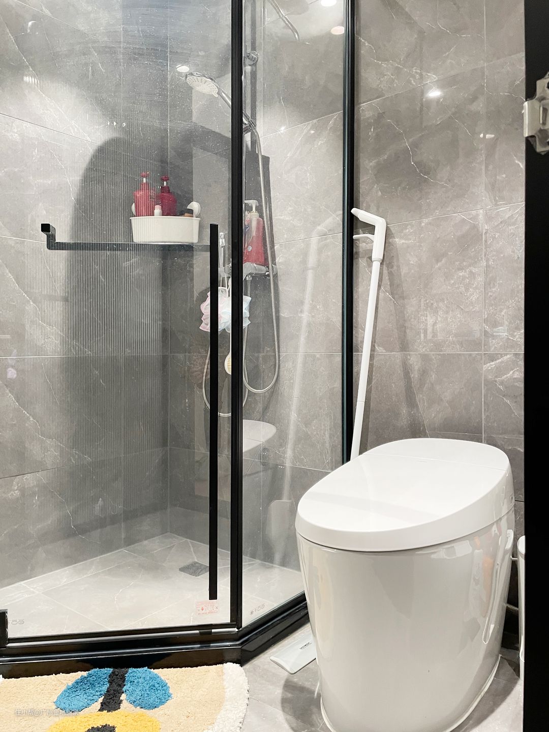 卫生间的面积并不大,悬浮的浴室柜的设计除了能让杨先生一家子能更轻便的打扫,也能节省空间,保证功能齐全且美观整洁好打理,悬浮的留空设计不会让空间看起来过于拥挤而显得局促,小型收纳柜也满足了收纳需求,底部也可以存放脸盆,小凳子等家居用品。