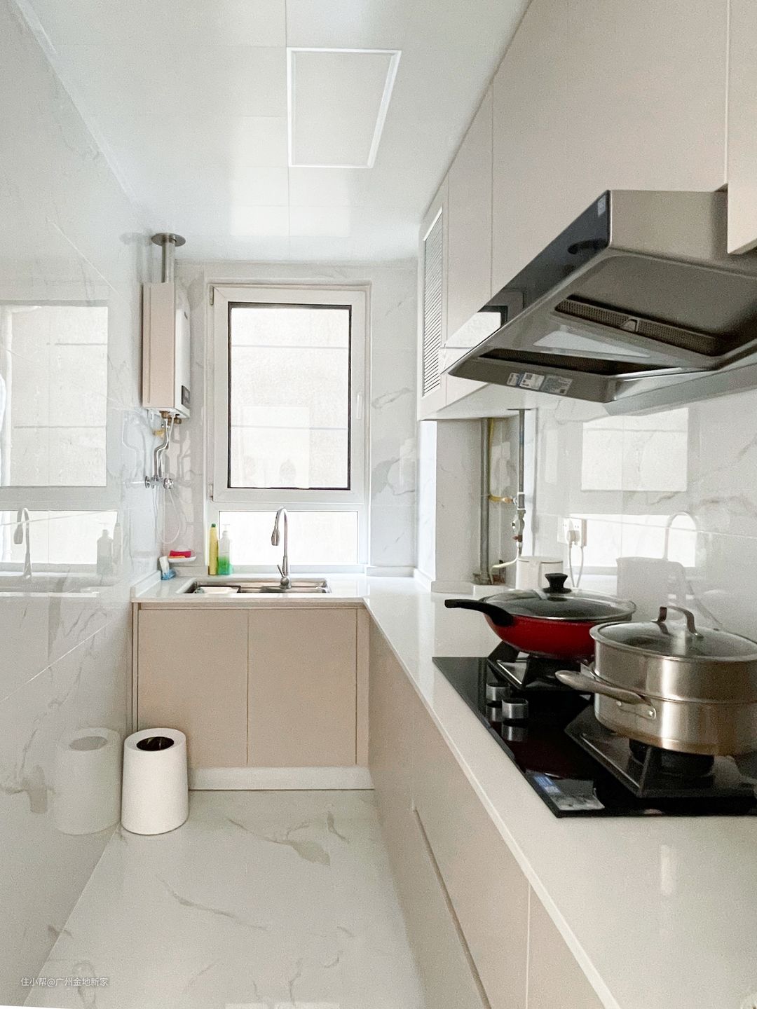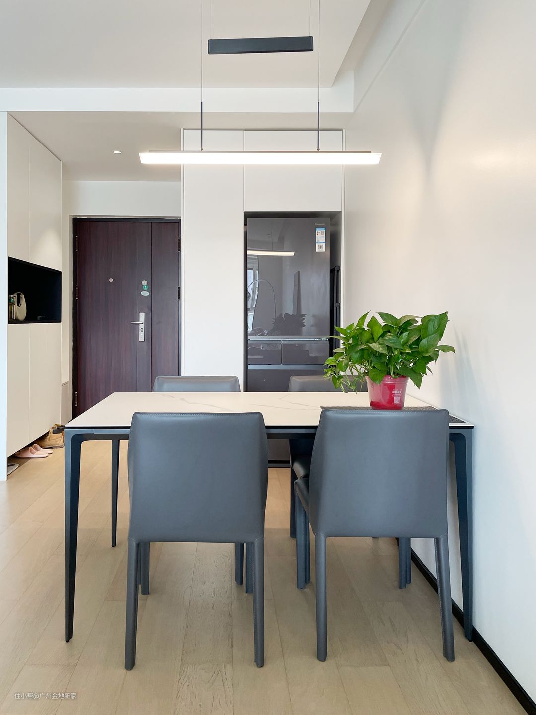 餐厅和客厅通铺了瓷砖,给简白的房屋里带来生活中该有的暖意🌞。放在餐厅的冰箱做了内嵌设计,(冰箱的尺寸是在施工前提前和杨先生确认好的,然后做出合适尺寸的定制柜),如此一来,减少卫生死角的同时,也给空间带来统一又整洁的观感。