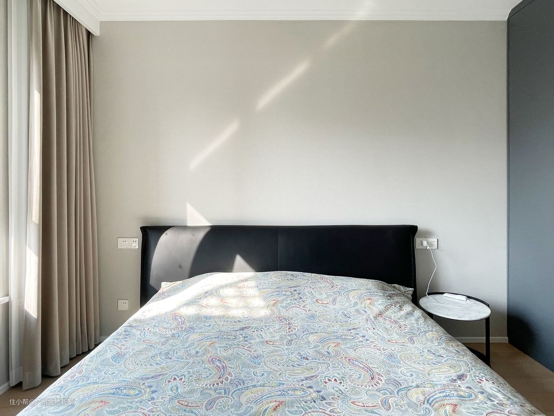 主卧依旧是简简单单不花里花哨的设计,浅灰白色的乳胶漆,比客厅的白墙能带来更安稳、平静的氛围,吊顶、衣橱、床头柜在选款的时候,也是按照带有黑色系去做搭配的。那时候去拍摄的时候杨先生买的其他软装配饰还没到,流出多余的留白,也是为了日后他们好装饰自己的房间。