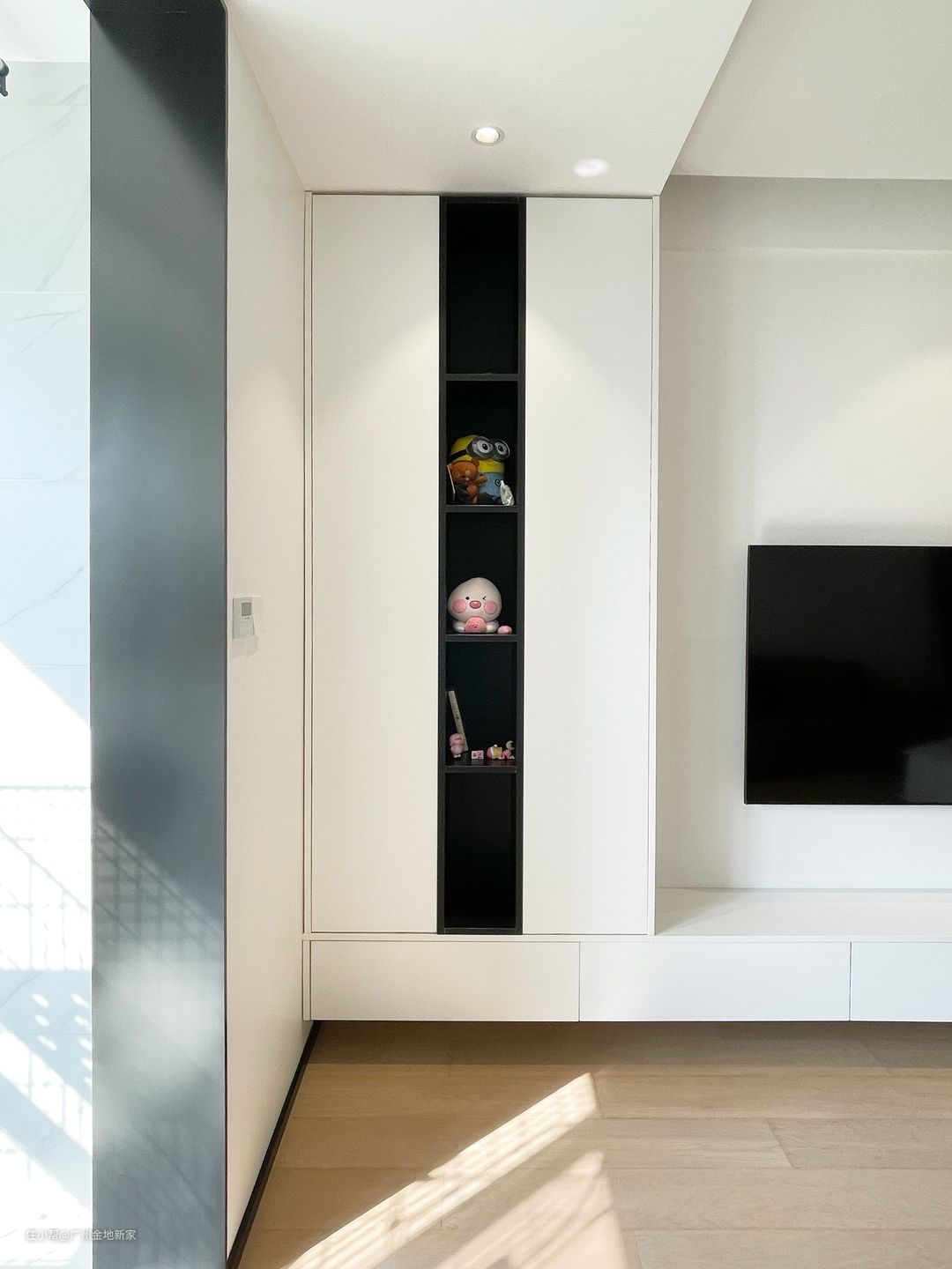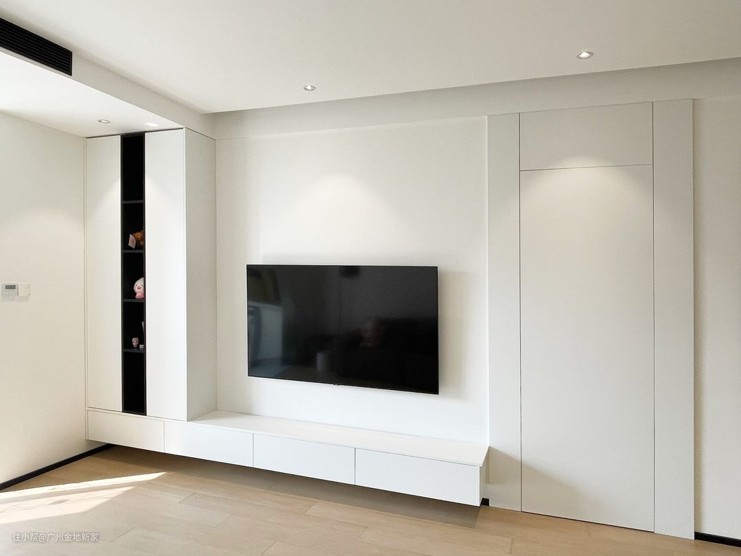 做成极简风格的话,把电视柜设计成颜值高又没有卫生死角的悬浮柜很合适,正好电视背景墙是房子里的承重墙,承重力也是够的,用重型吊码做固定,稳固性牢牢的~