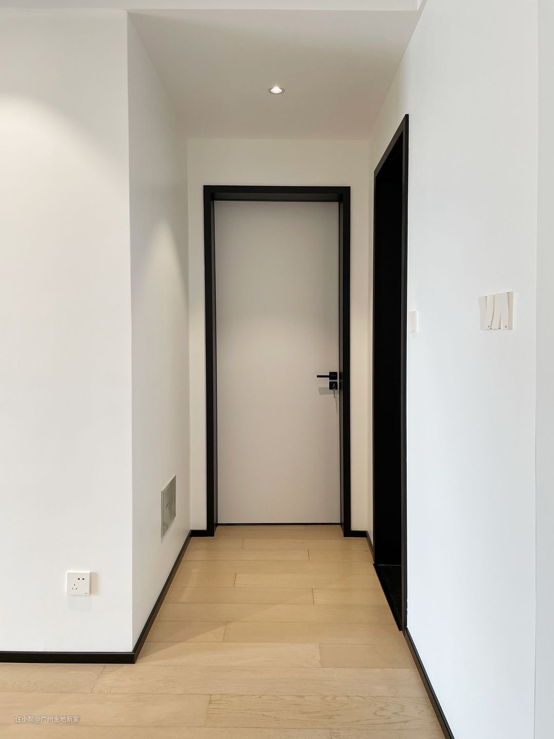 这里是走廊,踢脚线和门套都用了同色黑色的设计,可以让整体空间设计感更加高级,也更凸显出流畅的线条感,起到一定的扩容效果。