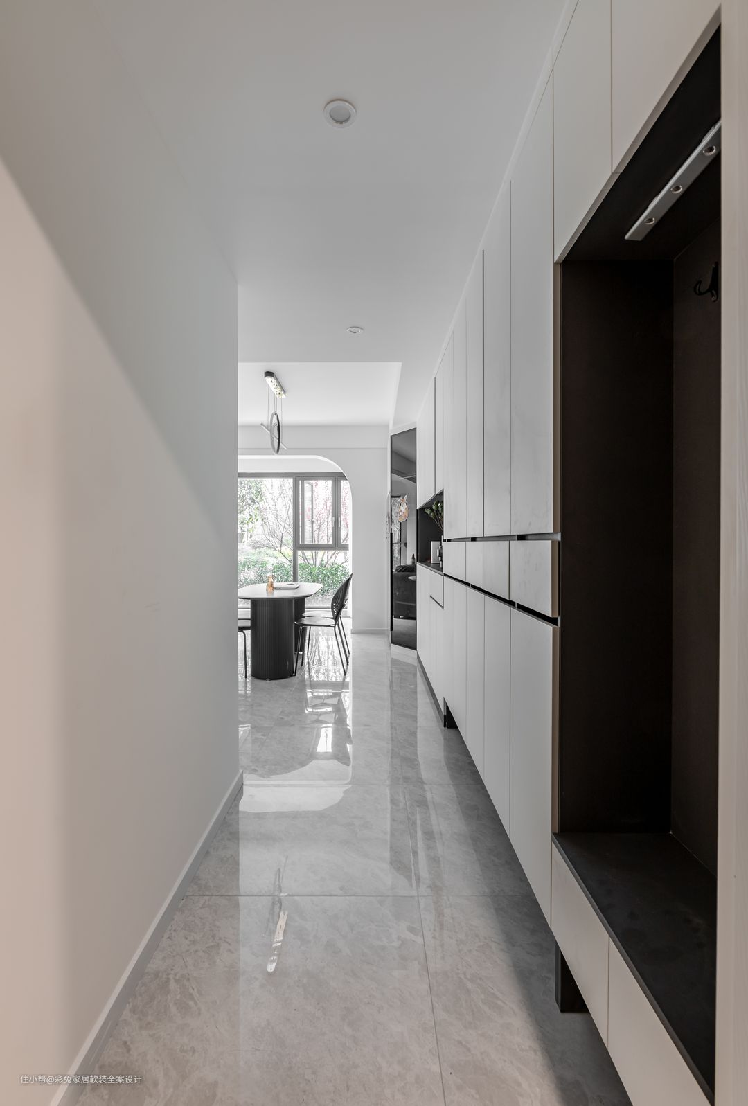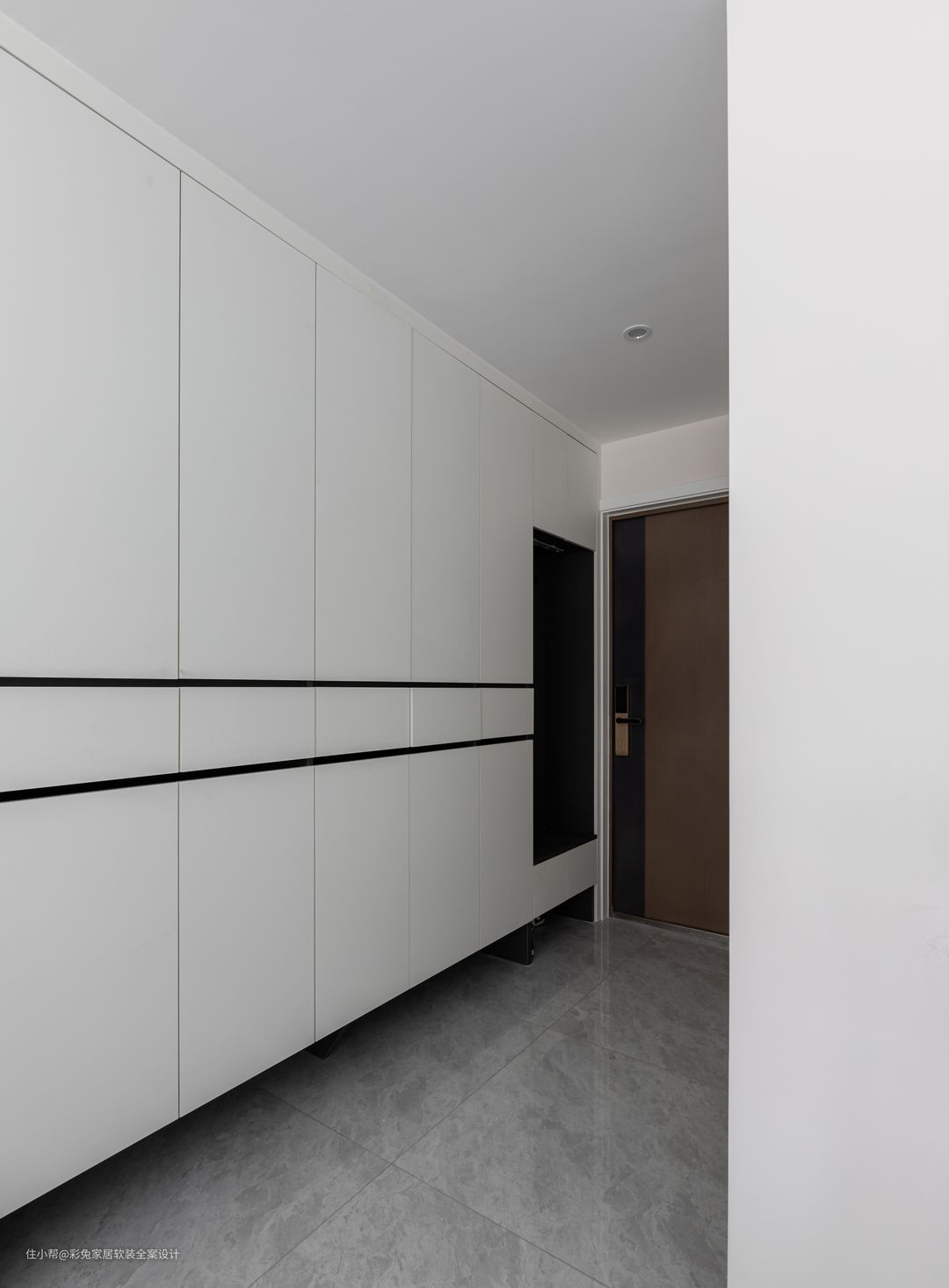 挂衣区用栏栅格装饰,彰显了家的精致感;灯带的嵌入,不仅满足了门厅的照明,还增加了空间层次感,给人舒适的入户体验感。