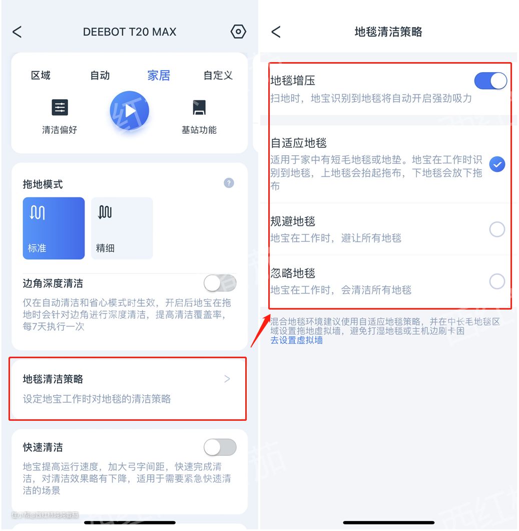 另外,在 APP中也开放了“地毯清洁策略”选项,除了可以打开“地毯增压”功能,针对地毯开启强劲吸力之外,还可以选择避开地毯或者干脆放弃拖布抬升,直接和普通地面一样处理 ▲