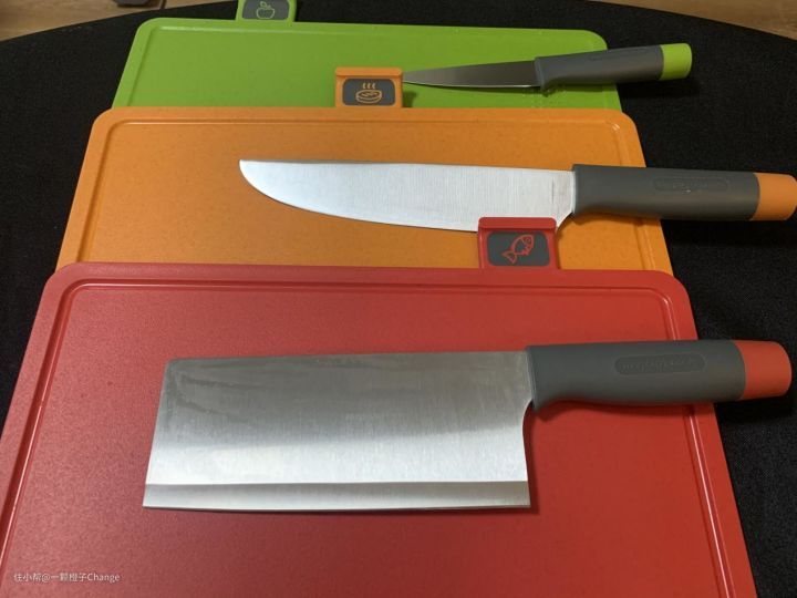 套装自带三把厨刀,从下到上分为砍切刀、多用刀和蔬果刀。刀柄后面的颜色正好与砧板颜色一致。