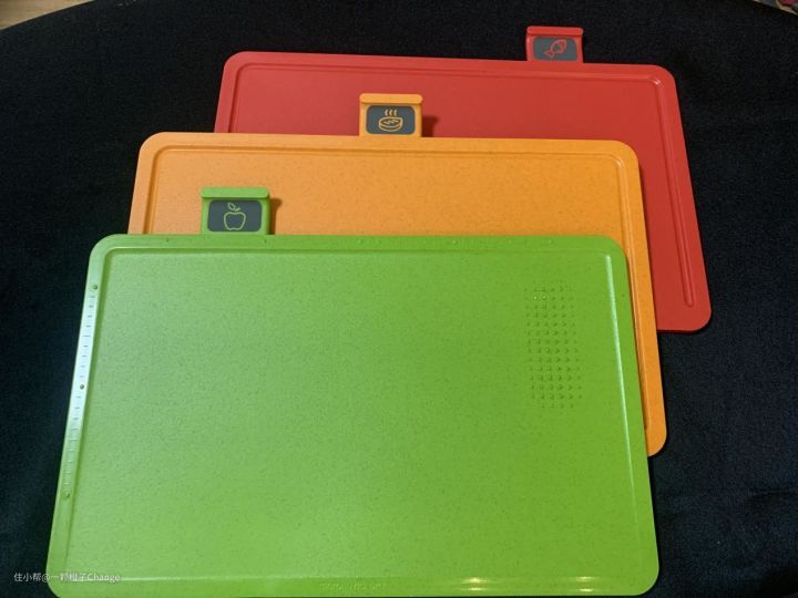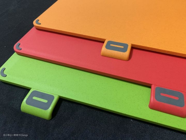 由于红色和橙色主要是处理肉类的砧板,所以在砧板边沿处增加了一圈凹槽,可以阻断肉汁和血水流到台面上。