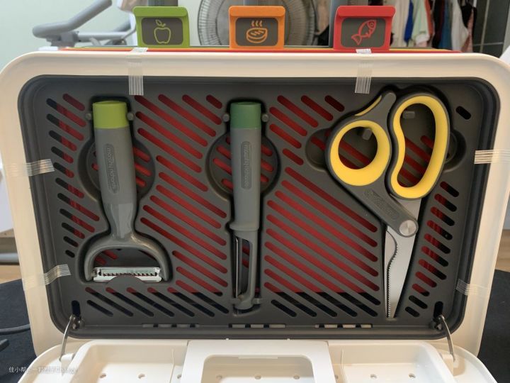 除了颜色的分类,砧板上的提取把手处也做了分类食物的图案标记。