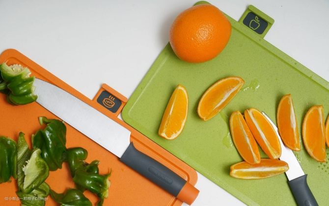 而绿色的蔬菜水果砧板,除了边沿多设计了一片小颗粒带,可以用来进行食物的研磨,同时边沿部分也做了升高处理,因为我平常切橙子的时候,都会有汁水留出来有的甚至太快会掉到地上,现在我也不用担心,因为有着延边保护也不用再担心橙汁会到处流,而且绿色蔬果板带有刻度的指示线,也让一些咱们追求高品质的家庭可以更好掌握料理食物的长度。