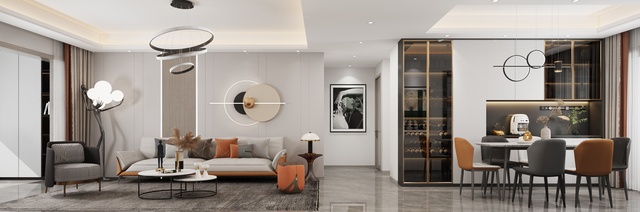 走进客厅,客厅以橙色作为整个空间的点睛之笔,地面铺设大砖,柔和的背景墙颜色,增强空间的品质,同时运用艺术的形式以及淡雅轻快的调子,打造一个轻松又自然充满诗意的居住氛围。