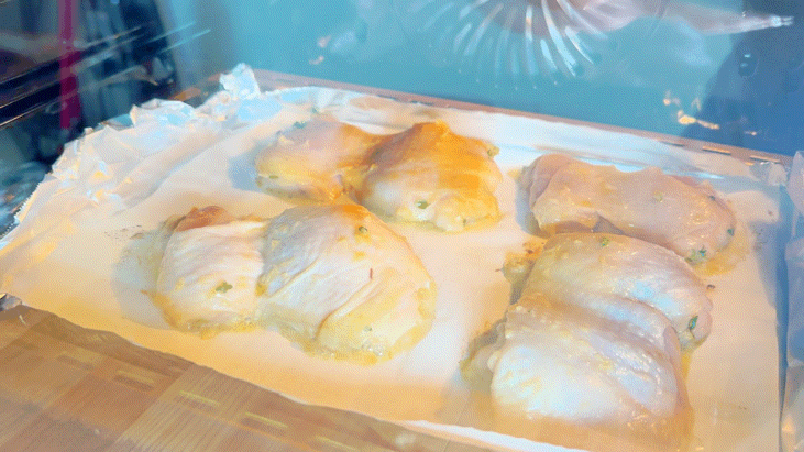 烤箱的平炉嫩烤模式非常适合用来烤制这种追求多汁嫩滑体验的料理,20min的料理时间足够将鸡腿肉表皮烤至微焦状态,而皮下的鸡肉则保持应有的水嫩多汁。