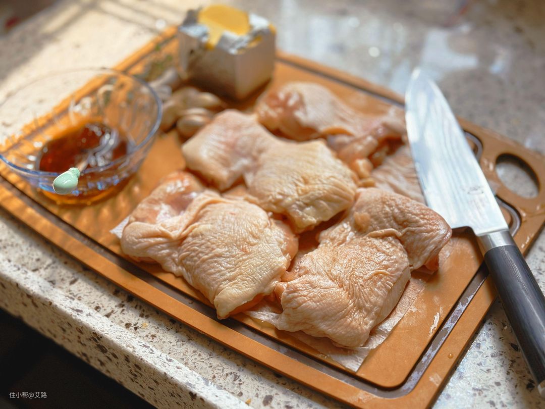 配料非常简单,黄油、蜂蜜、百里香、大蒜和分切好去骨的鸡腿扒即可。黄油和蜂蜜是非常美妙的搭配,而大蒜也和黄油有天然的化学反应,百里香则和鸡肉这种滋味偏淡的白肉很契合,所以把它们全部结合起来……简直就是1+1+1+1>4的存在!