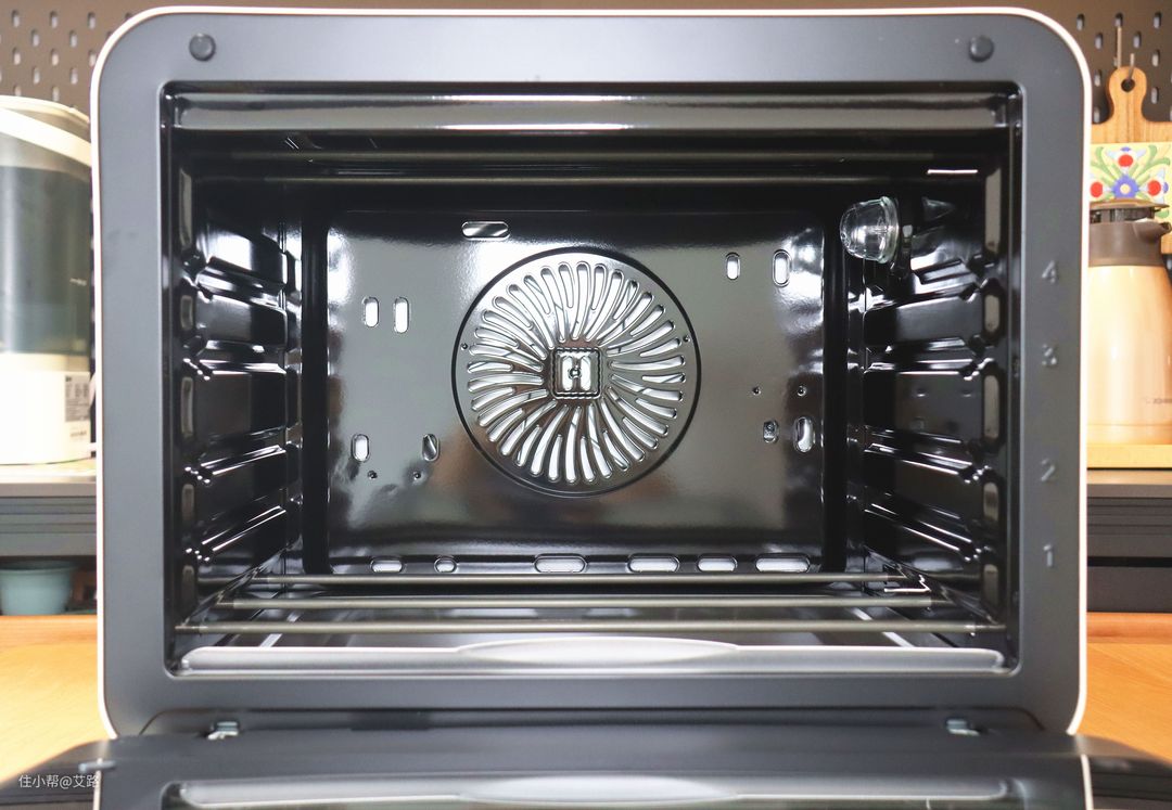 打开烤箱,内部是40L的超大空间和纯黑色的搪瓷内胆。烤箱内部最多可放置4层烤盘,上下分别配备3根发热管,背部还有一台大风炉。